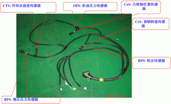 1)电磁阀断电:球阀关闭。控制腔压力+针阀弹簧压力> 针阀腔压力;针阀关闭,不喷射 2)电磁阀通电:球阀开启,泻油孔泻油。控制腔压力+针阀弹簧压力< 针阀腔压力;针阀抬起,喷射 针阀抬起速度取决于泻油孔与进油孔的流量差;针阀关闭速度取决于进油孔流量;喷射响应=电磁阀响应+液力系统响应;一般应为0.1ms~0.3ms (喷油速率控制的要求)。 发动机传感器线束 传感器线束包括:6个传感器线束及与整车相关的V4线束。 6个传感器分别为:轨压传感器(2.12、2.13、2.14)、水温传感器(2.15、2.16),机油压力传感器(2.24、2.27、2.28、2.32),进气压力温度传感器(2.25、2.33、2.34.2.36),曲轴转速传感器(2.19、2.23),凸轮轴转速传感器(2.09、2.10)。V4包括排气制动开关2.29、排气制动电磁阀2.06、空调压缩机继电器2.11以及ECU电源输出2.03。 柴油机自带的6个传感器都是非常重要的传感器,主机厂在安装时应特别注意防护 喷油器线束(cylinder connecter) 喷油器线束包括发动机6个缸的喷油器(injector)以及控制高压油泵的油量计量单元ZME(metering unit)。 预留四根接线: 白色(2.03):ECU的电源输出(24v);灰色(2.06):接排气制动电磁阀;橙色(2.11):