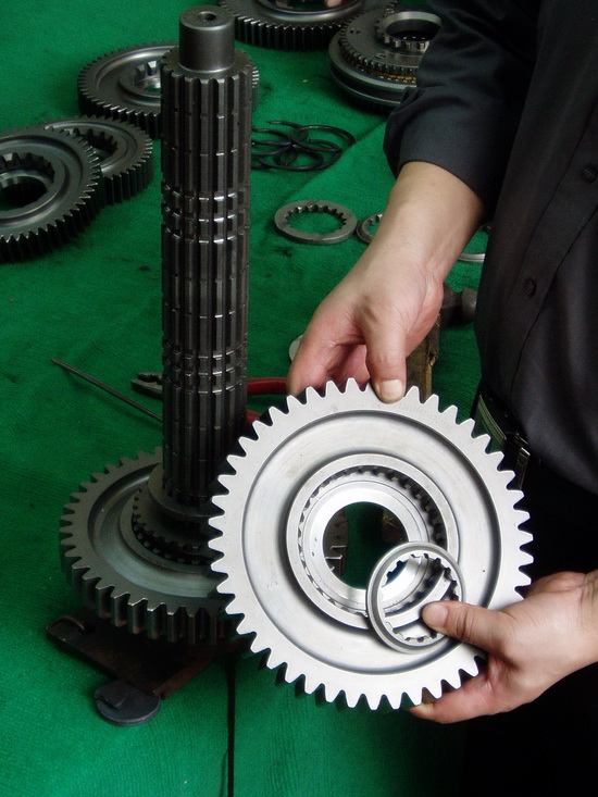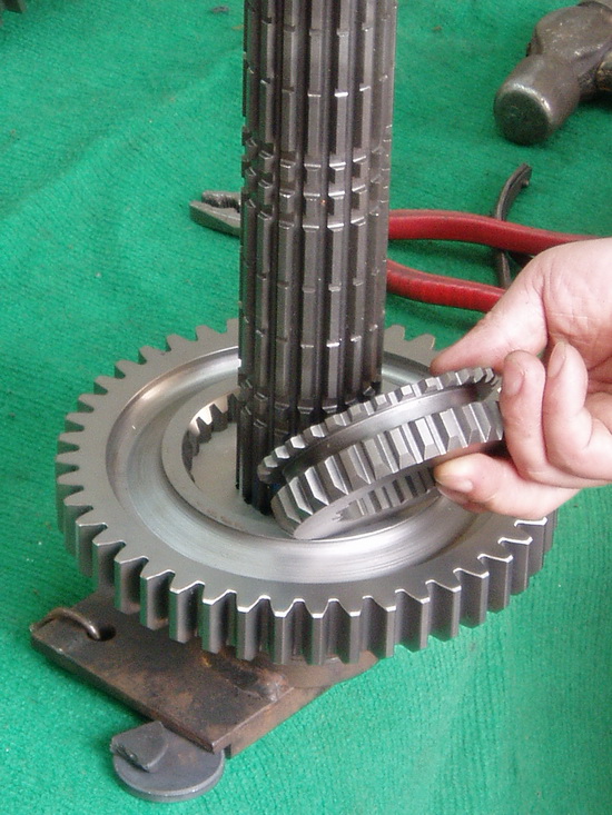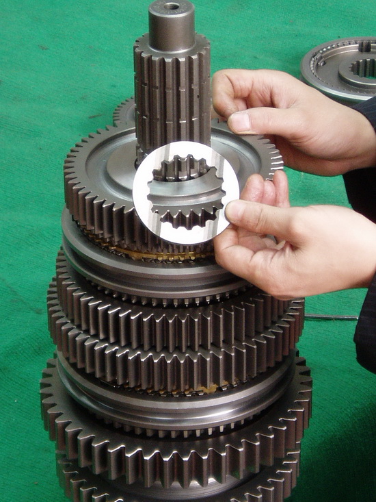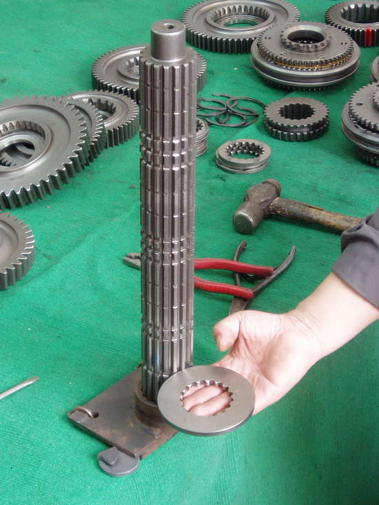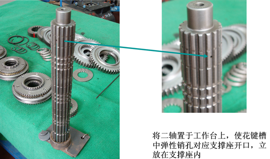 锁环式双锥面同步器 ● 12JS160T变速器二轴的装配 12JS160T变速器的二轴总成是免调整的,其装配流程请参照以下组图: 取倒挡齿轮啮合滑套,有啮合齿的一侧向下套入二轴。取二轴花垫套入二轴,在二轴第二个环槽内转一齿距,推送六角键穿过花垫。 取二轴一档齿轮,有啮合齿的一面朝上装入二轴,取有凸台的二轴花垫,凸面向上套入二轴第三个环槽,转一齿距,推送六角键穿过平垫。取一二挡同步器一侧组件,装入二轴并保证与一档齿轮啮合。 ● 二轴的装配流程图 取卡环装入卡环槽内,注意卡环开口处对准六角键,保证其穿动自如。装入一二挡同步毂,保证与前一步装入的同步器一侧组件相啮合,并用卡环固定。注意,同步毂内花键宽槽对准二轴六角键。推动六角键穿过同步毂。 取同步器组件装入二轴,使其与同步毂啮合。取一面有凸台的花垫,凸面向下套入二轴,在二轴第四个环槽内转一齿距,推动六角键穿过平垫。 取二轴二挡轮,凹槽一面向下套入二轴,使其与同步器相啮合。取二轴花垫,在二轴第五个环槽内转动一齿距,推送六角键,使其穿过花垫。 取二轴三档齿轮,啮合齿一面向上装入二轴。取一面有凸台的花垫,凸面向上装入二轴,在二轴第六个环槽内转一齿距,推送六角键,使其穿过花垫。取三四档同步器一侧组件装入二轴并与三档轮啮合。 取卡环固定同步器一侧组件。取同步毂,同步毂宽槽对准六角键装入二轴并与同步器组件啮合。 取卡环固定同步毂。取同步器另一侧组件,使之与同步毂啮合。 取一面有凸台的花垫,凸面向下装入二轴,在二轴第七个环槽内转一齿距,推送六角键,使其穿过花垫。取二轴四档轮,有啮合齿的一面向下装入二轴。 ● 二轴的装配流程图 取花垫,在二轴第八个环槽内转一齿距,推送六角键,使其穿过花垫。取二轴五档齿轮,有啮合齿的一面向上装入二轴。 取一面有凸台的花垫,凸面向上装入二轴第九个环槽内,转一齿距。推送六角键,使其穿过花垫。取五六档同步器一侧摩擦组建装于二轴上,并与五档齿轮啮合。 取卡环固定同步器摩擦组件,注意卡环开口方向。取同步毂,同步毂宽槽对正六角键装入二轴,并与同步器摩擦组件相啮合。 取卡环固定同步毂。注意卡环开口方向。将五六档同步器另一侧摩擦组件装于二轴上,并与同步毂相啮合。 取一轴齿轮,有啮合齿一面向下装入二轴,并与同步器摩擦组件相啮合。取二轴压板扣于一轴齿轮上,用螺栓固定。