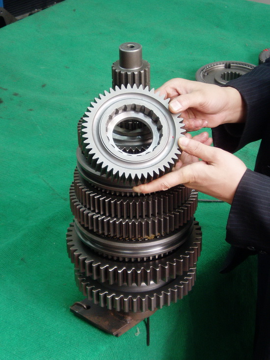 中间轴对比 ● 主箱“对齿” 为了解决双中间轴齿轮与主轴齿轮的正确啮合,装配时必须进行对齿。 ● 锁环式双锥面同步器 锁环式双锥面同步器其特征是有两个同步锥面副同时参与工作,在结构尺寸相近的条件下,同步器容量增加近1倍,减小了换档刀,缩短了同步时间,使换档操作性能明显改善,提高了整车的动力性和燃料经济性。 锁环式双锥面同步器零件