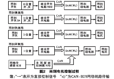 一辆2000年产奔驰W220 S320轿车,用户反映该车的雨刮器第一挡(间歇挡)只能动一次,以后不再持续工作(即无间歇挡工作),其他挡正常。 该款车的雨刮器控制完全改变由开关信号控制继电器模式,是由控制单元之间的CAN-BUS网络信号传输综合控制(图1)。