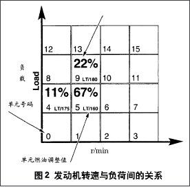 图2显示了车辆全负荷行驶条件下发动机转速与发动机负载之间的关系。随着条件的变化,PCM检查适当的数据组,用于计算准确的喷油嘴脉冲宽度,该数据组数值应为0%。如果短期燃油调整与0%差距较大,长期燃油调整将改变该数值,将短期燃油调整重新调定到0%。