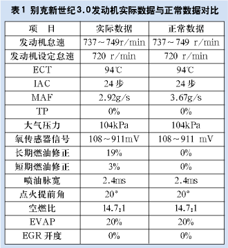 接车后,首先对该车的动力系统进行了车载自诊断,检查发现车载自诊断系统已经设置了故障码DTC P0171,表示燃油微调系统过稀;然后启动车辆,并使车辆运行到闭环状态,用汽车故障诊断仪检测发动机的各项数据,并与正常数据进行对比(如表1所示)。