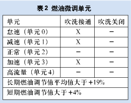 长(短)期燃油调整说明:发动机为了实现良好的驱动性能,同时兼顾燃油经济性和排放控制的最佳组合,采用了闭环空/燃计量系统。在闭环系统中,动力系统控制模块(PCM)监视加热氧传感器(HO2S)信号并基于加热氧传感器信号电压调节供油量。供油量变化可以通过故障诊断仪进行监视的长期和短期燃油修正调整值表示出来。理想的燃油微调值接近0%。如果加热氧传感器信号指示混合气过稀,动力系统控制模块将增加喷油脉宽,使燃油微调值稍稍高于0%。如果检测到混合气过浓,燃油微调值将稍稍低于0%,表示动力系统控制模块正在减少供油量。动力系统控制模块控制长期燃油微调的最大值在-25%~+20%范围内。动力系统控制模块控制短期燃油微调的权限在-27%~+27%之间。在确定燃油微调诊断状态前,动力系统控制模块在各种不同操作条件下监视燃油微调,称为燃油微调单元(如表2所示)。