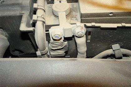 图1 电子转向助力泵 由于该车更换过助力泵,按要求应对其进行设定。在完成设定后,红色警告灯熄灭,信息中心的提示消失。随后进行试车,没过多久该车在行驶中再次熄火,且红色警告灯再次点亮,信息中心显示“模组配置失灵”。连接故障诊断仪进行检测,发现了“模组配置失灵”的故障码。根据故障码的提示,我们怀疑该车未安装旧模块读取数据。经检查,新模块的确未被写入数据。装复并重新进行设定后,故障警告灯熄灭。 继续试车,警告灯不再点亮,但发动机突然熄火。根据该车的故障现象,发动机熄火故障应另有原因。考虑到曲轴位置传感器直接影响着发动机的点火和喷油,于是笔者决定对该传感器及相关线路进行检查。经仔细检查发现,曲轴位置传感器插头的针脚存在虚接现象。 在取下插头对相应的针脚进行处理后,试车故障排除。 故障2 一辆长安福特福克斯2.0 L轿车,装备自动变速器,车辆在熄火约20 min后重新起动时发动机无法起动。 经检查发现,该车起动时起动机不运转。检查蓄电池电量充足,起动继电器工作正常,F13熔丝完好,变速器挡位信号正常。笔者怀疑起动机有问题,于是拆下起动机将其在蓄电池上搭接,起动机运转正常。此时再用万用表检查蓄电池到起动机的线路,发现该线路发生断路现象。经仔细观察,发现该线束靠近蓄电池极柱处的熔断器(图2)熔断。经查阅维修资料,得知这是一个150 A的熔断器。根据该熔断器多次熔断的情况,可以判定起动机内部存在着内部短路的情况。