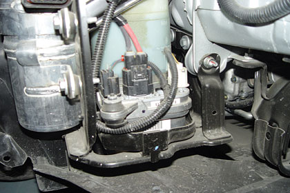故障1 一辆长安福特福克斯1.8 L自动挡轿车,用户反映该车曾发生过交通事故,电子转向助力泵(图1)损坏,更换转向助力泵后,仪表板上的红色警告灯点亮,信息中心显示“助力泵未配置”,之后车辆还出现了行驶过程中易熄火的故障。