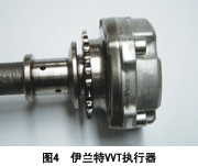 故障码P0012,其含义为“A”凸轮轴位置-正时延迟过大,即在诊断条件下,初始目标角与实际角的差值大于3°且10次以上,ECM记录该故障码。该发动机采用了连续可变气门正时系统(只改变配气相位,不能改变气门升程),简称CVVT系统,其配气机构驱动如图1所示。CVVT系统由VVT机油控制阀(图2)、VVT机油滤清器(图3)、VVT执行器(图4)及其他传感器、ECM等组成。VVT机油滤清器通过缸盖油道向VVT机油控制阀供油;发动机控制模块ECM根据发动机的转速、负荷等参数控制滑阀式的VVT机油控制阀,向VVT执行器的气门正时提前油室或气门正时滞后油室供油;VVT执行器根据供给的油压直接改变排气凸轮轴的相位,通过链条传动,间接改变进气凸轮轴的配气相位,使进气门正时连续变化。