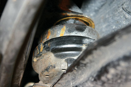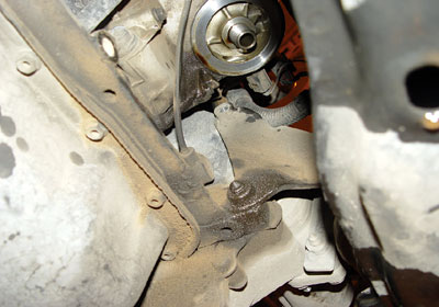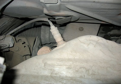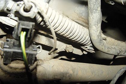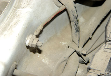 检查:用V.A.G1551进行检测,没有任何故障记录,读取数据块各项数据都在正常范围之内,检查火花塞并试更换高压线,试车故障仍然存在。对发动机燃油系统进行免拆清洗,清洗后试车故障依旧。此车在怠速状态下运转平稳,这时想到如果线束有故障,用手晃动线束怠速应该出现不稳现象。于是在怠速状态下,晃动发动机线束,当晃动到左前纵梁处的线束接地点(图6)时,即在蓄电池附近,发动机出现怠速抖动,而在这一接地点上加装一根防盗器喇叭的接地线,该车在装完防盗器后,该处螺钉没有拧紧,造成此故障。