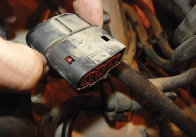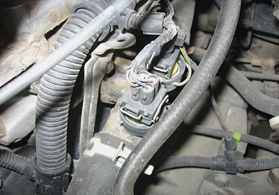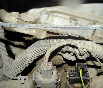 经检查,发现在冷却液温度传感器上方的发动机第2、3缸的触发信号线(图15)似连非连。这样当变速器挂入R挡时,发动机缸体有顺时针(站在汽车左侧看)转动的趋势,使得该点火触发信号线断路;当变速器挂入D挡时,发动机缸体有逆时针(站在汽车左侧看)转动趋势,点火信号线导通,所以就出现了挂入R挡起步犯闯,挂入D挡起步平稳的现象。