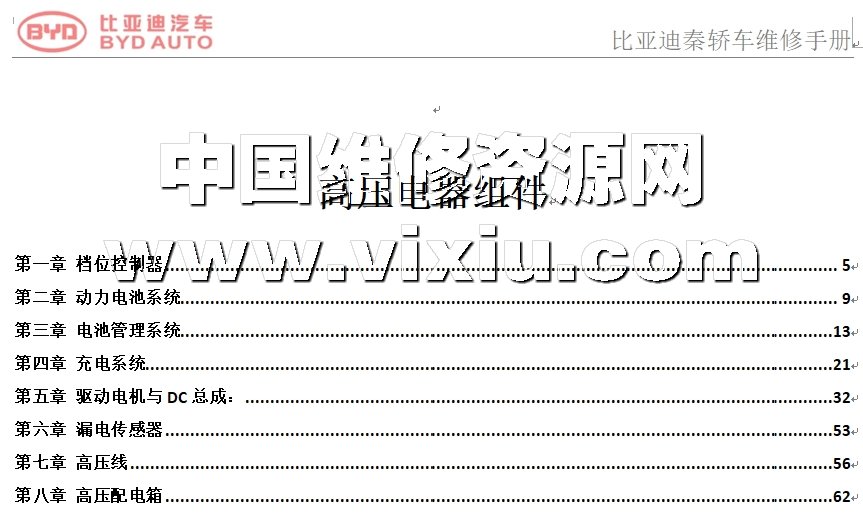 全套比亚迪新能源车型技术资料,包括2018-2017年款宋DM,宋EV,2016年款唐,秦EV,2015年款秦,2016年款E5,E6等车型。整车维修手册,电路图,技术培训资料