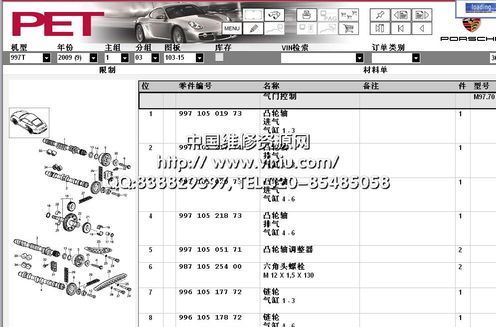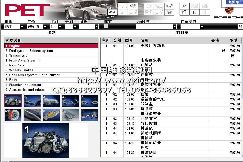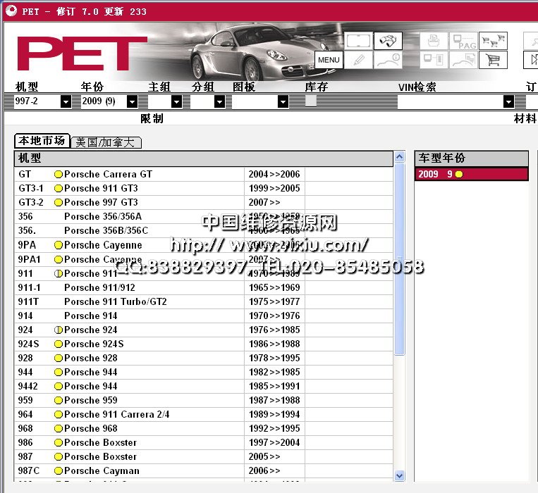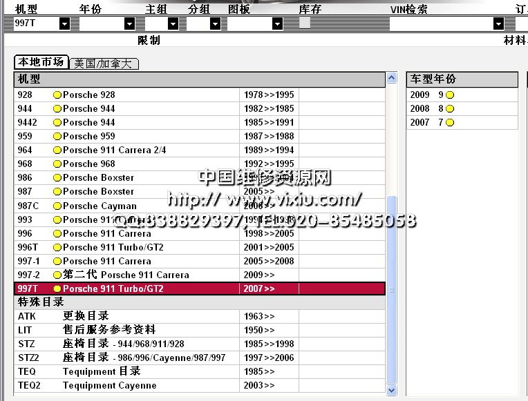 在线升级版 保时捷汽车配件电子目录PET7,有2015款Cayenne、911、Boxster 保时捷配件信息查询系统包括跑车、轿车和越野车的配件信息。支持按车型、车架号、配件编码等多种查询方式,功能强大,简单易用。欧洲市场 车型 -1950>>1959 Porsche 356/356A1960>>1965 Porsche 356B/356C1970>>1976 Porsche 9141976>>1985 Porsche 9241986>>1988 Porsche 924S1982>>1985 Porsche 9441985>>1991 Porsche 94421992>>1995 Porsche 9681985>>1998 Seats-Catalogue 944/968/911/9281997>> Seats-Catalogue Boxster/911 Carrera1963>> Exchange-Catalogue1965>>1969 Porsche 911/9121970>>1973 Porsche 9111974>>1989 Porsche 9111975>>1977 Porsche 911 Turbo1989>>1994 Porsche 911 Carrera 2/41994>>1998 Porsche 911 Carrera1987>>1988 Porsche 9591978>>1995 Porsche 9281997>> Porsche Boxster1998>> Porsche 911 Carrera2001>> Porsche 911 Turbo/GT21999>> Porsche 911 GT32003>> Porsche Cayenne1985>> Tequipment-Catalogue2003>> Tequipment Cayenne