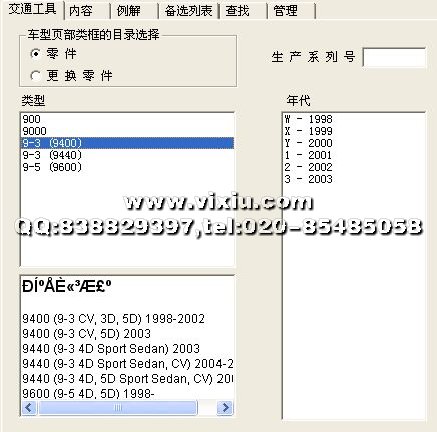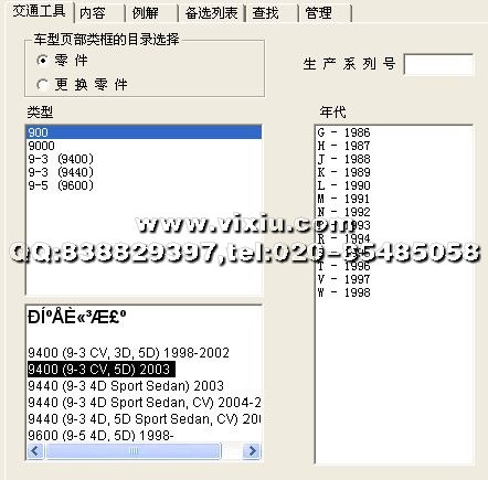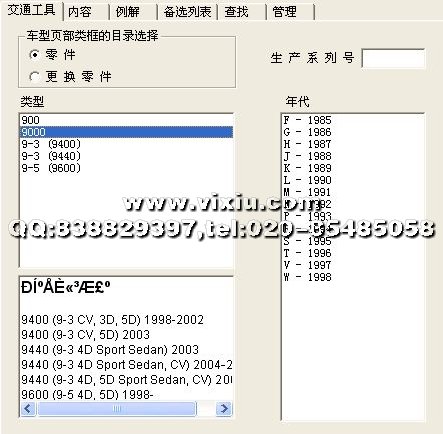 SAAB绅宝汽车配件电子目录(2009/01),含有从1985年到2008年的900,9000,9-3(9400),9-3(9440),9-3(9600)全球绅宝汽车配件资料库,全中文操作界面,支持VIN(YS3)编码查询!