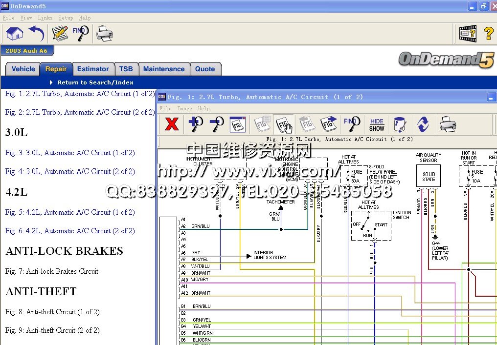 Mitchell汽车维修数据库的详尽准确程度与原厂维修手册一致(某些方面比原厂手册更准确,因为在编辑过程中纠正了原厂维修手册上的很多错误),并保持Mitchell数据库特有的风格和查⒉Mitchell数据库有如下特点:1. 内容丰富准确数据库中包含了从1983年至今美、欧、亚世界各国51个汽车制造厂商的近5000种车型的维修资料。您只要选定了车辆的生产年代、厂家、车型即可进入相应的维修目录,在不同的维修目录下根据发动机型号、变速器型号等的不同有更为详细的分类,使您查找资料更快捷、更准确。如您不能确定汽车的年代、型号,数据库还提供了17位码(VIN——车辆识别码)的解码信息。您只要查到汽车的17位码,就可以用它准确地了解该车的详细参数。Mitchell数据库将车型精确定位在“年款”,极大地保证了资料的准确性,这是市场上常见的书籍资料无法比拟的,这也是美国电子维修资料彻底垄断市场的最重要原因之一。2. 完整统一的电路图数据库中的每一款车型都有40至80张系统电路图,并且对电路图中电脑的每一个管脚、每一条线的定义和颜色都有说明。因为各个汽车制造商提供的资料格式不同,考虑到客户的使用方便,Mitchell公司没有象其他公司那样简单地将图形扫描下来,而是用CAD进行重新绘制,使所有电路图清晰准确,风格统一,便于查阅。Mitchell电路图将原厂多达10几张的系统电路图分析后,重新绘制成2至3张电路图,阅读更加方便。也就是说,只要您能够读懂一个车型的电路图,您就能利用数据库中所有车型的电路图进行分析、诊断。3. 详细准确的电气元件位置图今天的汽车越来越复杂,电子元件越来越多,而且不同汽车的结构差别较大。维修人员往往因为不能确定某一电子元件的位置而束手无策。数据库中提供了所有车型的电气元件位置,除了文字说明外,还附有图解,一目了然,方便易用。4. 零件分解图和参数针对每一款汽车,Mitchell数据库不仅有各种总成详细的拆卸安装步骤,而且还有清晰的零件分解图和准确的参数进行参考,使您修车更方便,更快捷。5. 技术服务公报是Mitchell数据库的精华汽车制造商针对已经生产的车型,每年都要发布大量的技术服务公报,内容包括该车型的各种最新技术信息,如维修技巧、安全召回信息等内容,对维修厂帮助很大。在Mitchell数据库中您既可以在总成中分别查找与该总成相关的技术服务公报,又可以同时查找所有的技术服务公报,条理清晰,简单易用。