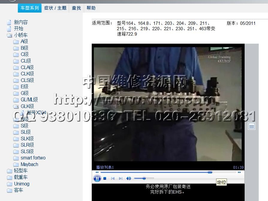 包括奔驰全车系轿车、重卡、客车等的维修技术视频指引,如拆装,检测,诊断等。现在最新版本,更新到2014年2月。